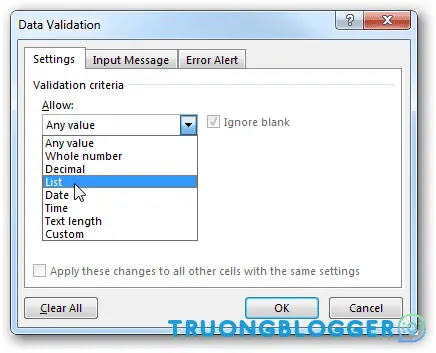 Cửa sổ Data Validation hiện ra, bạn có thể thiết lập để Excel giới hạn dữ liệu trong các loại ngày tháng, số, số thập phân, thời gian hoặc có chiều dài nhất định bằng cách chọn trong thẻ Settings. Nếu bạn muốn tạo danh sách chọn dưới dạng trình đơn thả xuống, hãy chọn List.