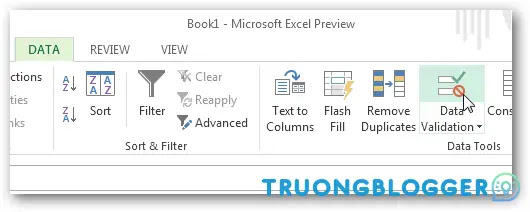 Sau khi chọn cột B, bạn nhấp vào thẻ Data trong menu Ribbon rồi nhấn nút Data Validation trong nhóm Data Tools.