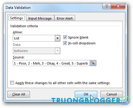 Mẹo: Mặc định Excel không cho phép chúng tai chọn Validation data từ sheet khác, tuy nhiên bạn có thể gõ thẳng tên sheet khác và dấu “!” vào trước trước phần source như hình bên dưới thì sẽ được{alertSuccess}